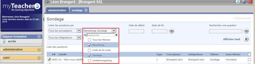 Utiliser les listes déroulantes (concepteurs, intégrateurs, thèmes, sous-thèmes) ou les dates de début et de fin, pour filtrer la liste des questions.