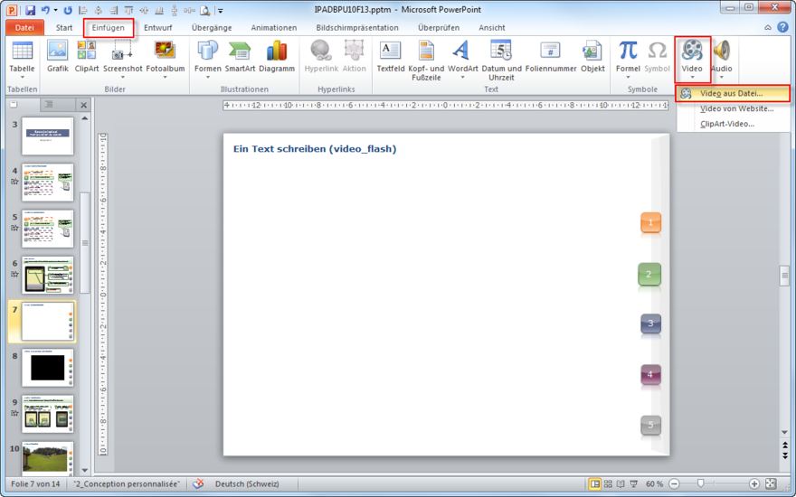 Dann klicken Sie auf Einfügen > Video > Video aus Datei und fügen das gewünschte Video ein.