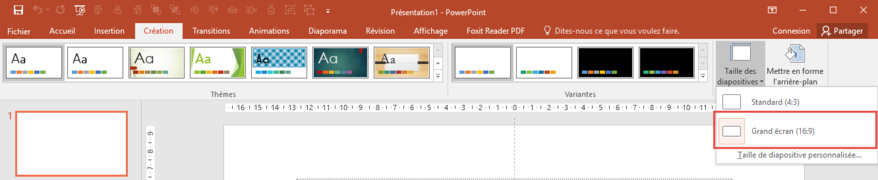 To do this, in the module's PowerPoint file, click on Create > Slide size, and select Wide Screen (16:9).