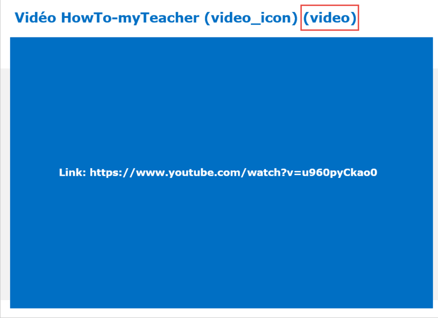 It contains the lesson name in the title, optionally followed by "video_icon" in brackets, which sets a video icon in the lesson summary, and ending with the mandatory keyword "video" in brackets, which indicates this as an external video.