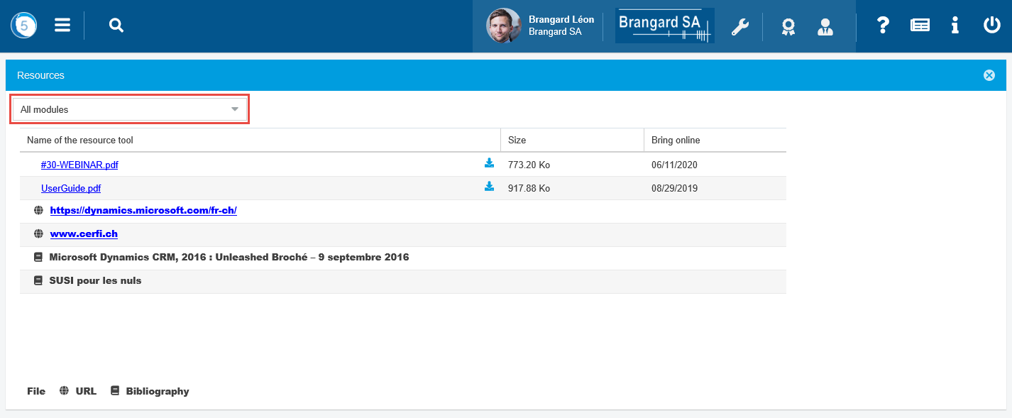 It is possible to display the resources of a given module. For that, select the module in the drop-down list.