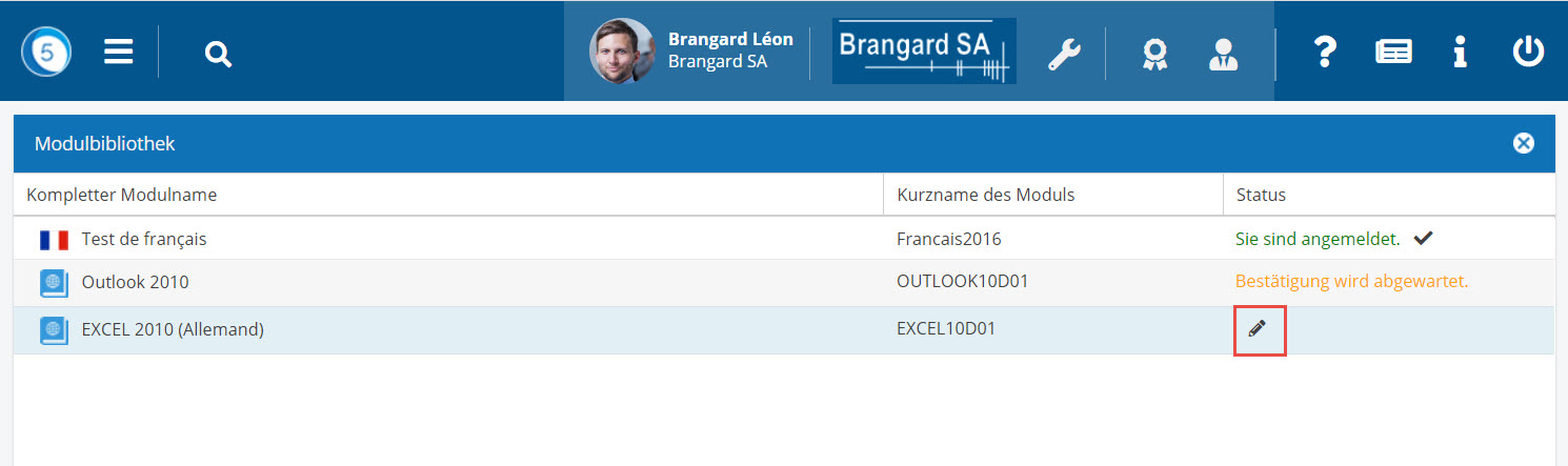 Sobald die Bestätigung durch den Administrator erfolgt ist, wird der Status des Moduls in der Modulothek Sie sind angemeldet.