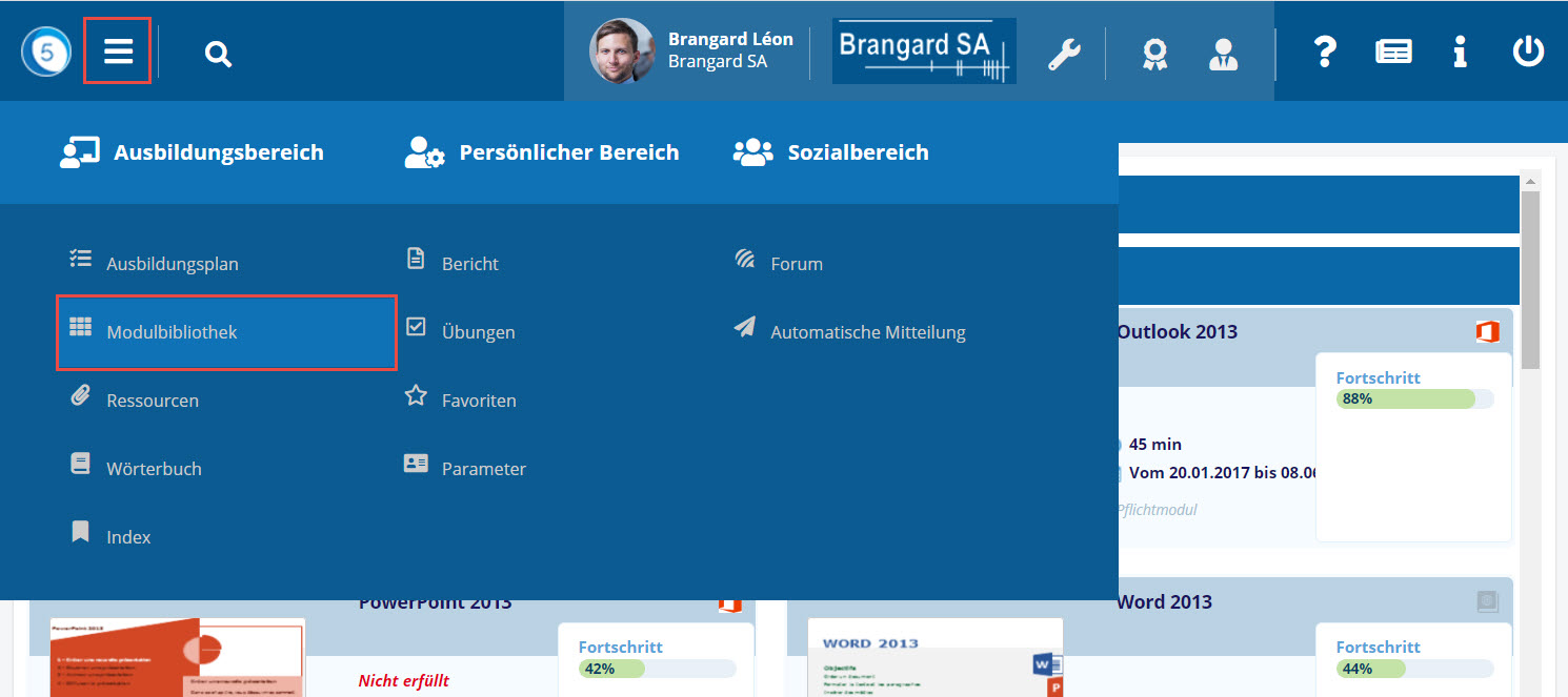 Die Module, bei denen der Benutzer über die Modulothek angemeldet ist, erscheinen in seinem persönlichen Lehrgang.
