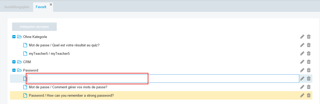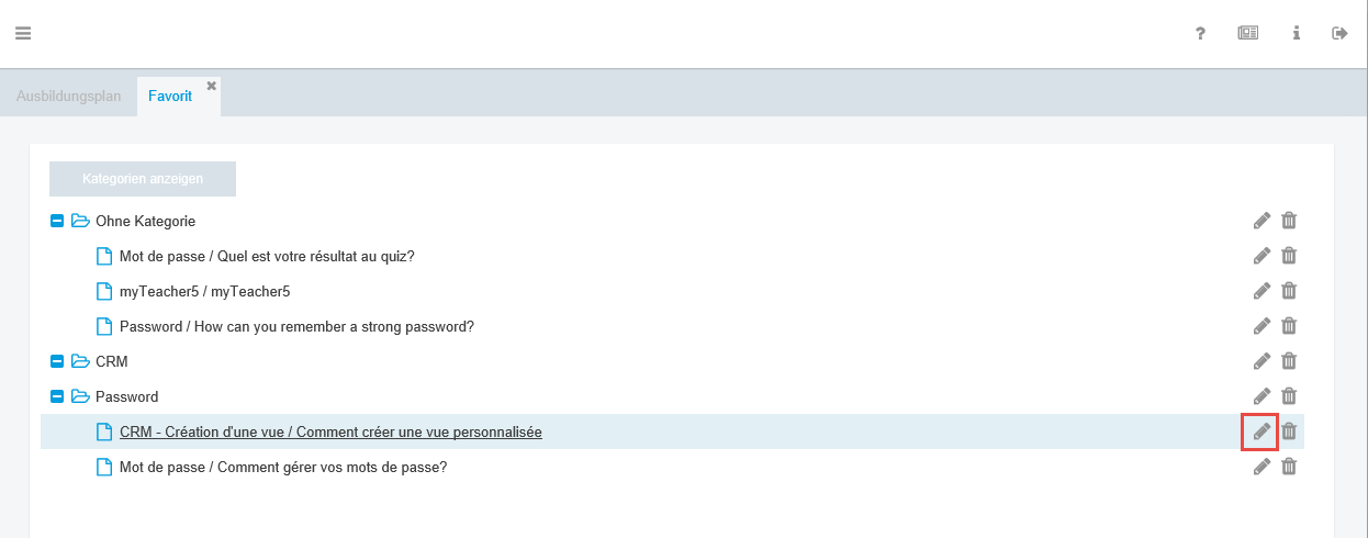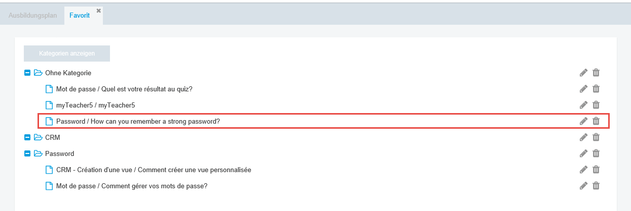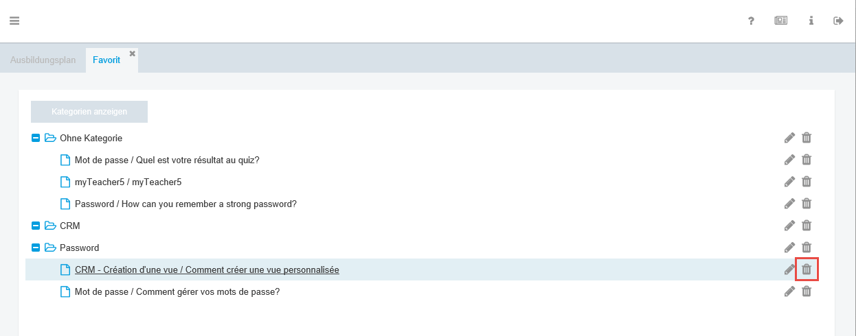 Die Rubrik Favorit bietet die Möglichkeit, direkte Links zu den Lektionen anzulegen, die den Benutzer interessieren. Die Favoriten können nach Kategorien sortiert werden.