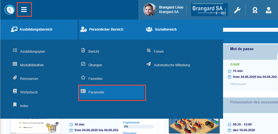Klicken Sie auf das Burger-Menü und dann auf Parameter im Persönlicher Bereich.