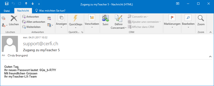 myTeacher zeigt an, dass ein neues Passwort an die E-Mail-Adresse des Benutzers gesandt wurde.