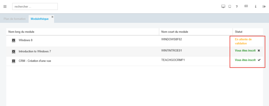 Après avoir soumis une demande d'inscription nécessitant une validation d'un supérieur, le statut du module dans la modulothèque est En attente de validation.